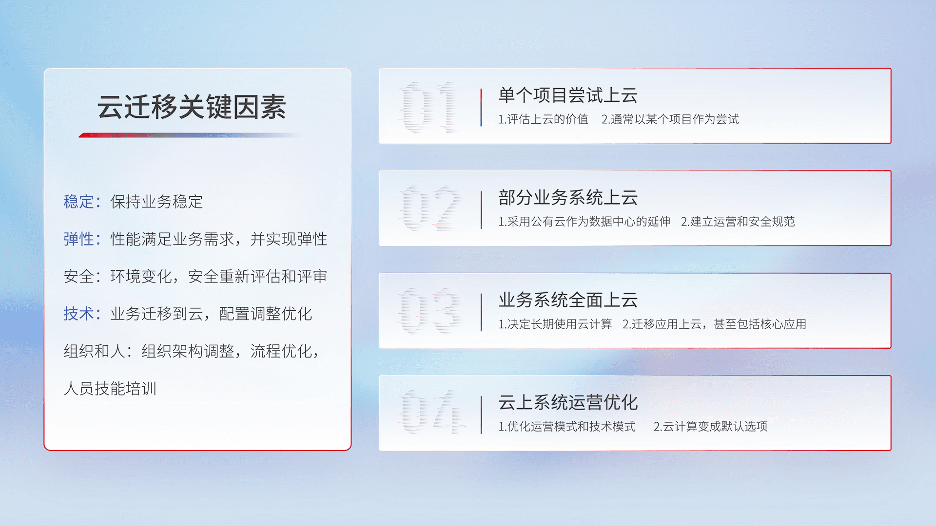 结合实际业务,,,从规划设计、、云平台选型、、、、云原生改造、、、数据迁移、、、集成交付,,迁移全过程为客户识别最佳上云路径,,做好风险识别管理,,设计网络架构、、、身份权限、、安全审计合规、、、、操作审计、、、日志审计、、、、监控告警策略、、、、多站点容灾设计等,,对云上基础设施进行整体规划,,提升IT治理水平,,,以满足弹性、、、高可用、、、、高性能的需求。。。
