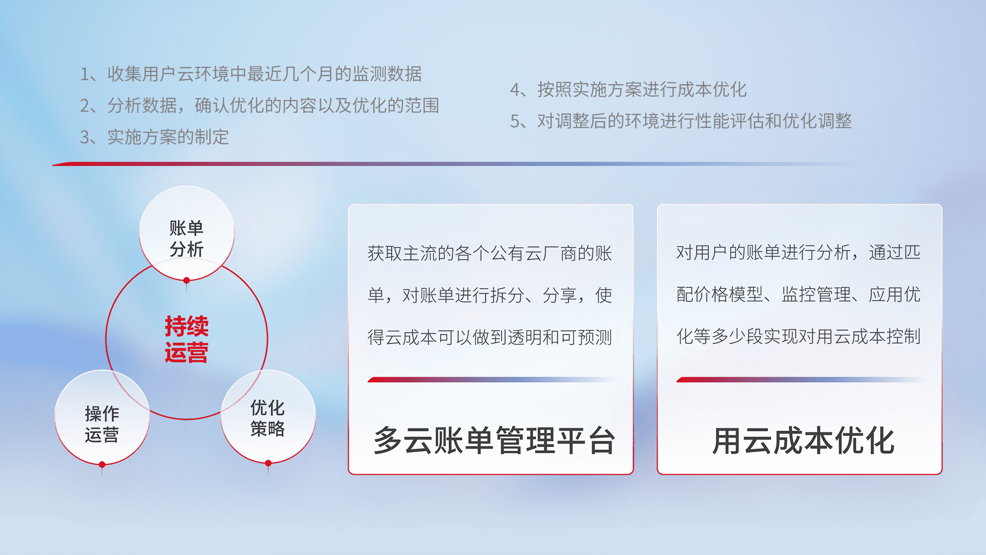 通过多云纳管,,以统一的资源数据模型把客户的云资源进行抽象和封装,,,进而实现对多云资源的统一操作,,,,保障云资源管理的可靠性、、、、稳定性与可用性。。。。量身定制化运维内容,,配置、、、、开发运维、、补丁管理、、、、备份、、、监控、、、认证和访问管理、、、、审计和日常巡检等,,,保障在用云过程中的可靠度,,,稳定度以及高可用率。。